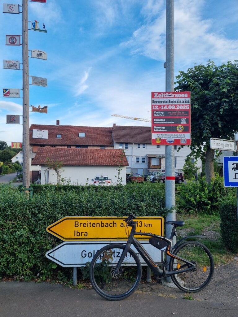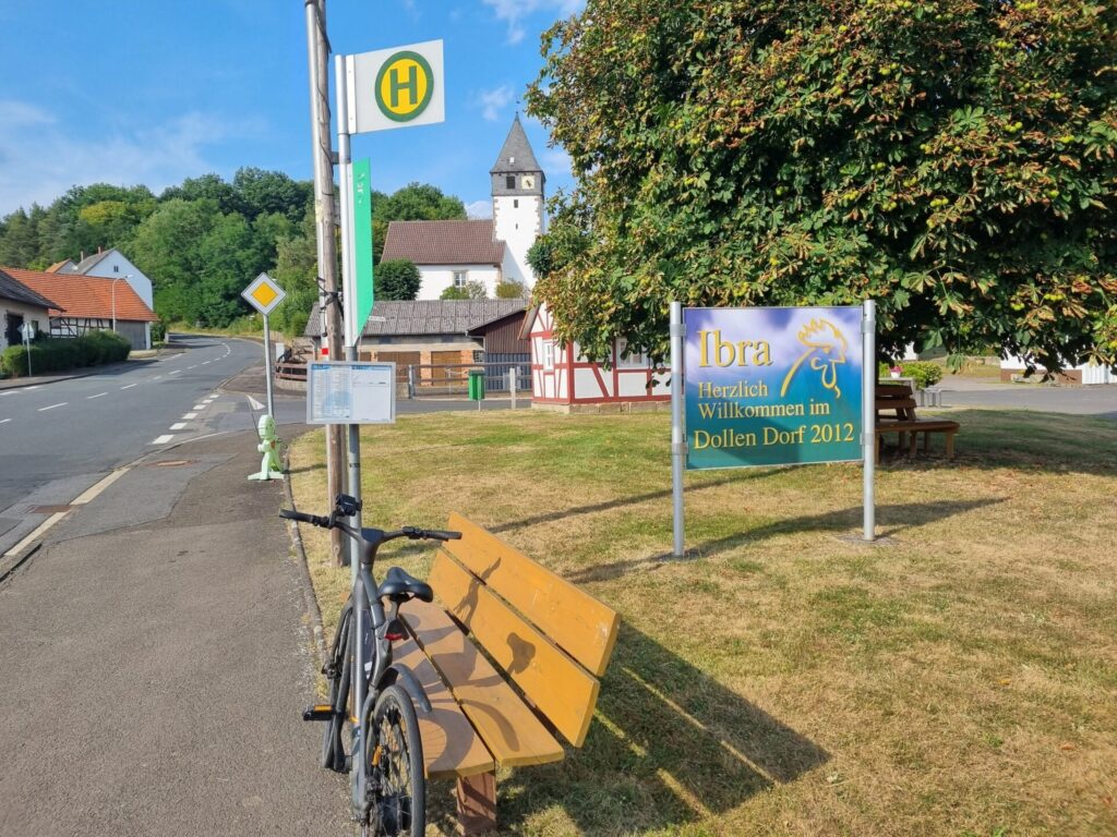 Ibra grüßt an einer Bushaltestelle als „Dolles Dorf“ des Jahres 2012. Ein kleiner Ortsbummel oder eine Wanderung zur Ibrakuppe sind empfehlenswert. Ich will aber weiter den Bahnradweg erkunden und muss nach Ibra kräftig in die Pedale treten, um auf der L 3294 nach Hausen zu kommen.