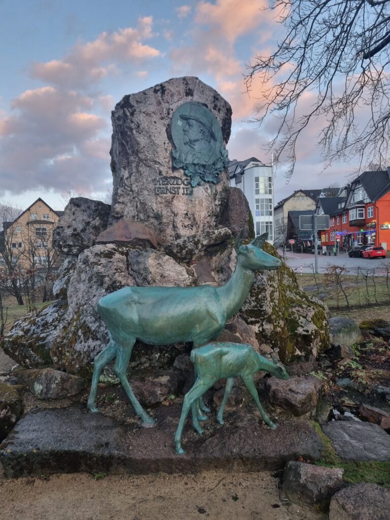 An der Ecke Crawinkler Straße finden wir eines der Wahrzeichen von Oberhof: das Denkmal für Herzog Ernst II. zu Sachsen-Coburg und Gotha.