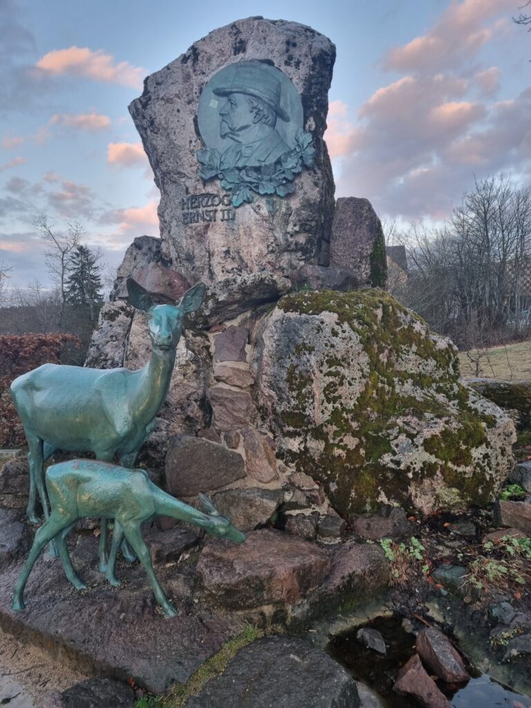 Auf einer Tafel zum „Oberhofer historischen Stadtbummel“ finden wir eine Chronologie, die mit der Einweihung im Jahr 1903 beginnt. Gestiftet wurde das Denkmal vom Oberhofer Hotelier Fritz Fleischer. Hirschkuh und Hirschkalb weisen darauf hin, dass der Herzog ein leidenschaftlicher Jäger war.