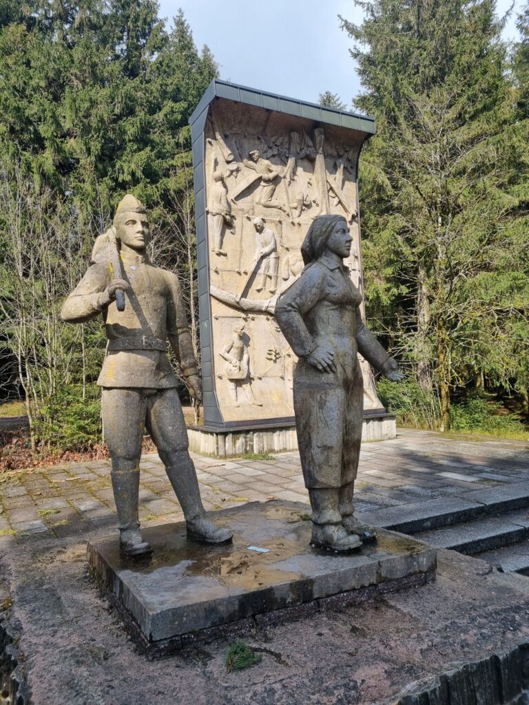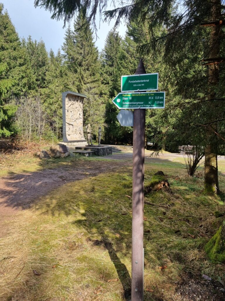 Wir folgen dem Veilchen-Symbol und überqueren die Landstraße L 3247 auf einer modernen Fußgängerbrücke. Schon bald stehen wir vor dem Forstarbeiter-Denkmal, das erst 1981 zu Ehren zehntausender Waldarbeiter/innen, freiwilliger Helfer und sowjetischer nach dem Windbruch von 1946 und den Borkenkäferjahren 1947 bis 1949 den mittleren Thüringer Wald retteten, errichtet wurde. „4,7 Millionen Festmeter Schadholz mussten in kürzester Zeit unter schwierigsten Bedingungen aufgearbeitet und 21.000 Hektar Kahlfläche im Anschluss wieder aufgeforstet werden.“ heißt es auf einer kleinen Tafel. Respekt!