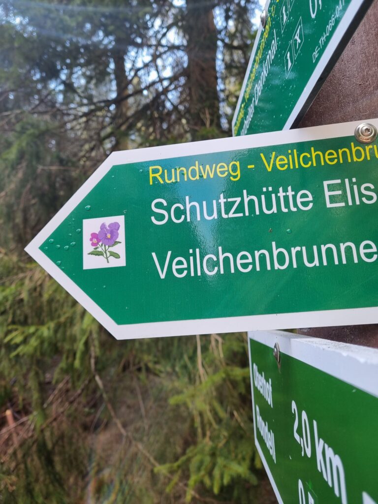 Auch die Natur kommt auf diesem Wanderweg nicht zu kurz. So ist der Quellbrunnen Veilchenbrunnen einen Besuch wert und auch das Schützenbergmoor mit seinem Lehrpfad bietet besonders im Winterwald immer wieder wunderschöne Ansichten. Dieser Weg kann aber auch zu allen anderen Jahreszeiten herrlich erwandert werden“. (O-Text Ende).