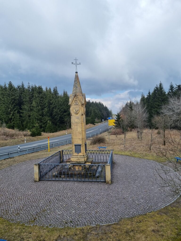 Auf dem (kostenpflichtigen) Parkplatz am Rondell gibt es jede Menge Infotafeln zum „Dach des Thüringer Waldes“ und natürlich auch zum Rondell. Auf 826 Metern Seehöhe überquert man am Rondell die Landstraße 3247 von Gotha nach Suhl. „Ein Denkmal in Form eines Obelisken weist auf den von Preußen mitfinanzierten Bau der Straße hin (1830-1832). Diese wurde dringend für den zollfreien Verkehr über den Rennsteigkamm benötigt. Vier gusseiserne Tafeln erinnern außerdem an die Personen, die an der Umsetzung des Projektes beteiligt waren, allen voran der leitende Ingenieurkapitän Julius von Plänckner. Der Bau dieser Straße war wichtig, um eine kürzere Verbindung zwischen den Herzogtümern Gotha und Coburg zu schaffen“, ist auf einer grün-weißen Tafel zu lesen.