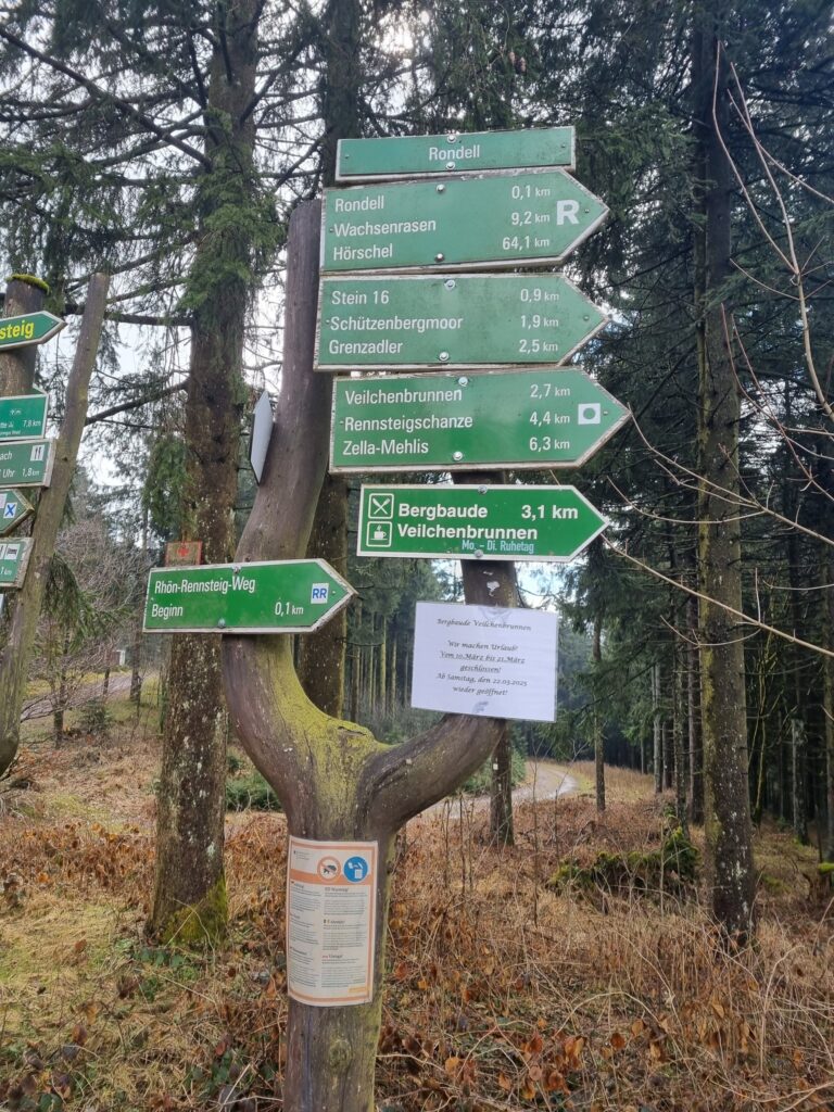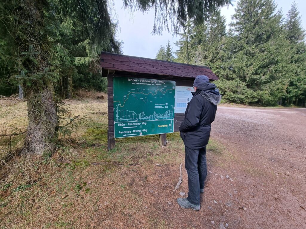 Schon nach wenigen Schritten stoßen wir auf eine Tafel zum Rhön-Rennsteig-Weg, der von der Wasserkuppe nach Oberhof führt.