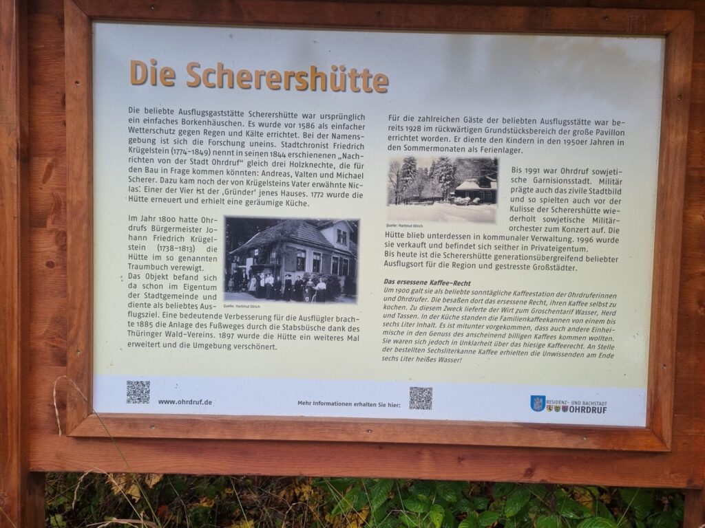 Zur Scherershütte finden wir sogar eine Infotafel, auf der wir erfahren, dass die beliebte Ausflugsgaststätte ein einfaches Borkenhäusschen war, das 1586 als Wetterschutz errichtet wurde. Der Stadtchronist Friedrich Krügelstein (1774-1849) erwähnt die Holzknechte Andreas, Valten und Michael Scherer als mögliche Erbauer. Auch ein Niclas Scherer kommt noch als Gründer des Hauses in Frage. Die Hütte wurde 1772 erneuert und bekam eine geräumige Küche. Ab 1800 befand sich das Haus in Stadteigentum und im Jahr 1885 bewirkte die Anlage eines Fußweges durch die Stabsbüsche durch den Thüringer-Wald-Verein eine deutliche Aufwertung. In den 1950er Jahren diente sie als Sommerferienlager für Kinder. Weiter ist auf der Tafel zu lesen: „Bis 1991 war Ohrdruf sowjetische Garnisionsstadt. Militär prägte auch das zivile Stadtbild und so spielten auch vor der Kulisse der Scherershütte wiederholt sowjetische Militärorchester zum Konzert auf. Die Hütte blieb unterdessen in kommunaler Verwaltung. 1996 wurde sie verkauft und befindet sich seither in Privateigentum. Bis heute ist die Scherershütte generationsübergreifend beliebter Ausflugsort für die Region und gestresste Großstädter“. (O-Text Ende)