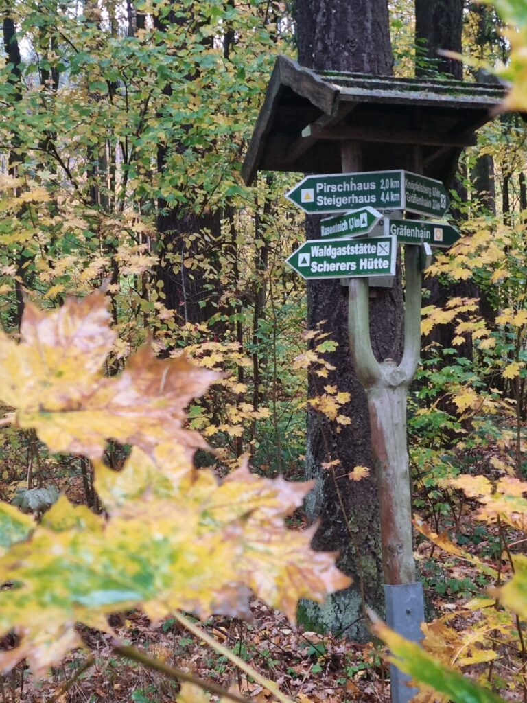 Um die Scherershütte zu erreichen, führt uns das Navi über die Suhler Straße an einen Verkehrskreisel und von dort über den Müllersweg auf die Scherershüttenstraße. Diese könnte man auch wunderbar durch den farbenprächtigen Wald erwandern oder erradeln. Vom Kreisel sind es fast 3 Kilometer, auf denen man ein Landschaftsschutzgbiet durchquert und einige Wanderwegweiser vorfindet. Fast pünktlich zur Eröffnung des Waldgaststätte kommen wir an und wollen erst einmal den Regenschauer bei einem köstlichen Eis- Dessert abwarten.