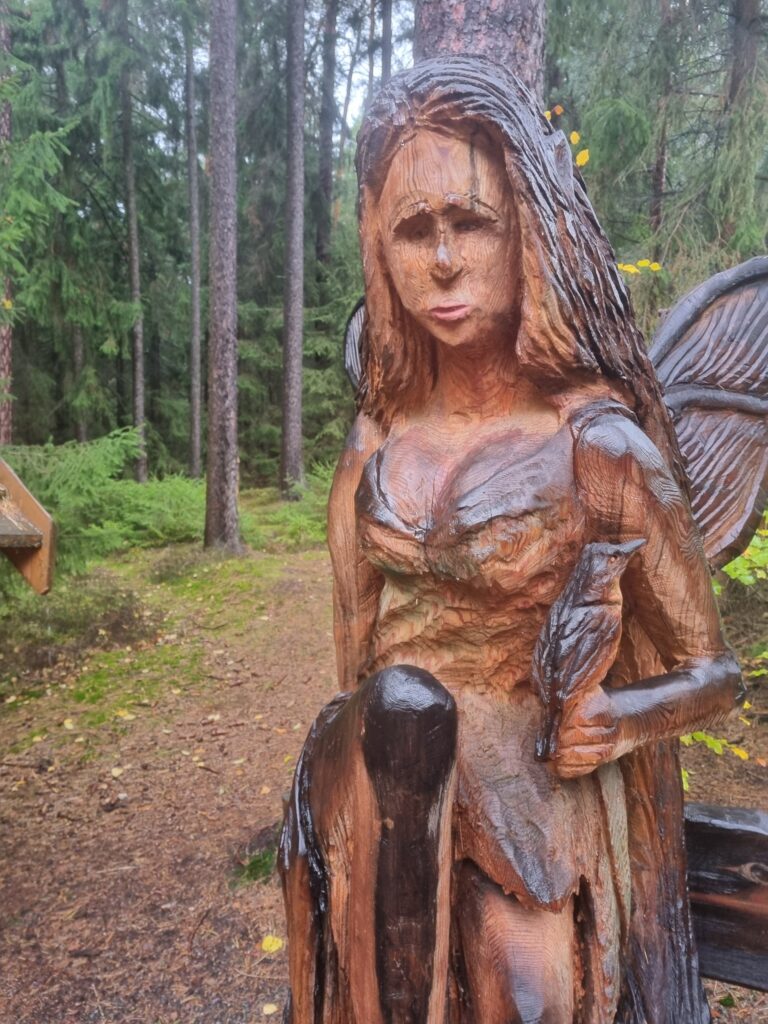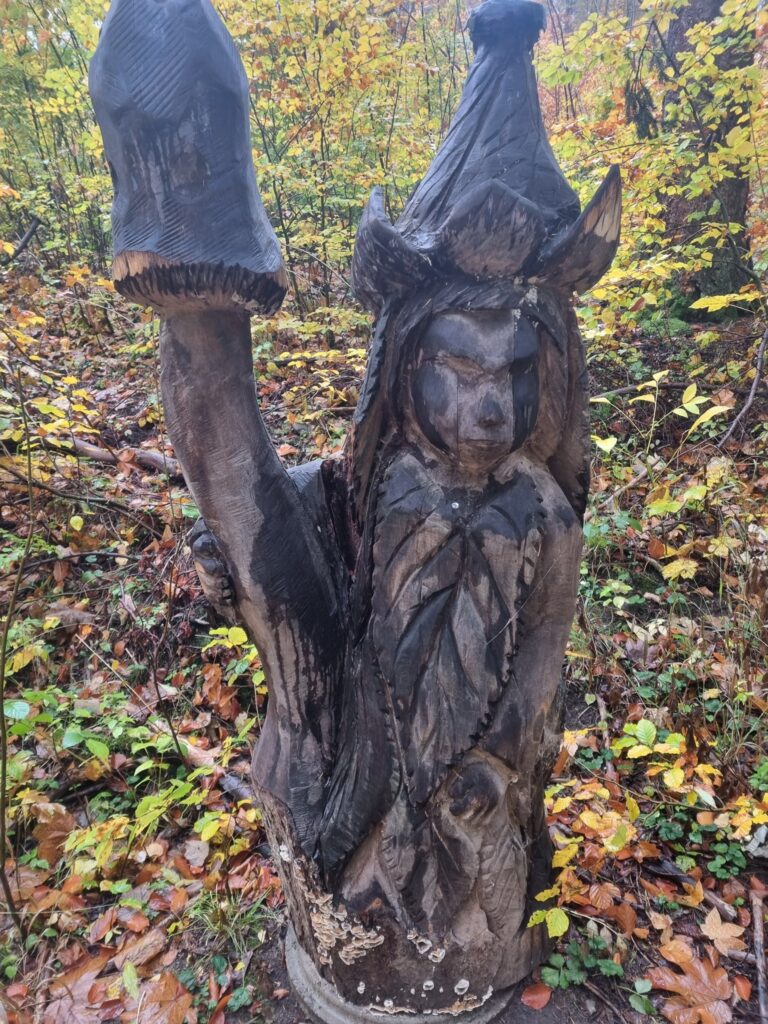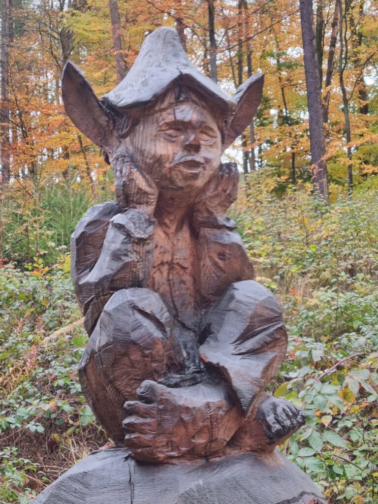 Der Regen ließ nach und los ging es auf dem „Waldgeister- und Feenpfad“ in Richtung Lindenstein. Prächtige Schnitzfiguren säumten den Wegrand und auf einer Tafel erfuhr man folgendes zu diesem herrlichen Pfad: „Die auf dem Feen- und Waldgeisterpfad zu sehenden Holzfiguren wurden im Rahmen des MDR-Frühlingserwachens am 29. April 2023 von talentierten Holzkünstler*innen angefertigt.“