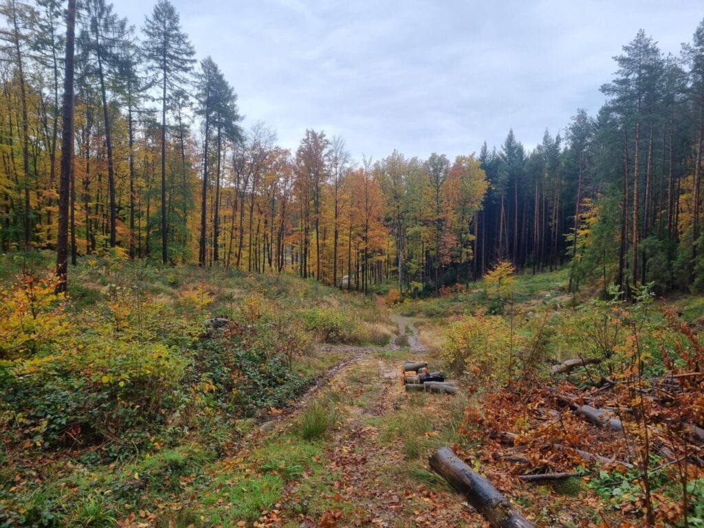 Mir allerdings bleibt nicht viel Zeit, denn schon verdunkelt sich der Himmel wieder. Schnell zurück zur Scherershütte. Auf dem Weg, der nunmehr ausschließlich bergab verläuft, fällt neben den Holzfiguren auch noch eine Infotafel zum Ohrdrufer Stadtwald auf. Hier erfährt man, dass dessen Ursprung auf Ankäufe und Flächenabtretungen aus ehemaligem klösterlichen Besitz zurückgeht und bis ins Jahr 1220 nachvollzogen werden kann.