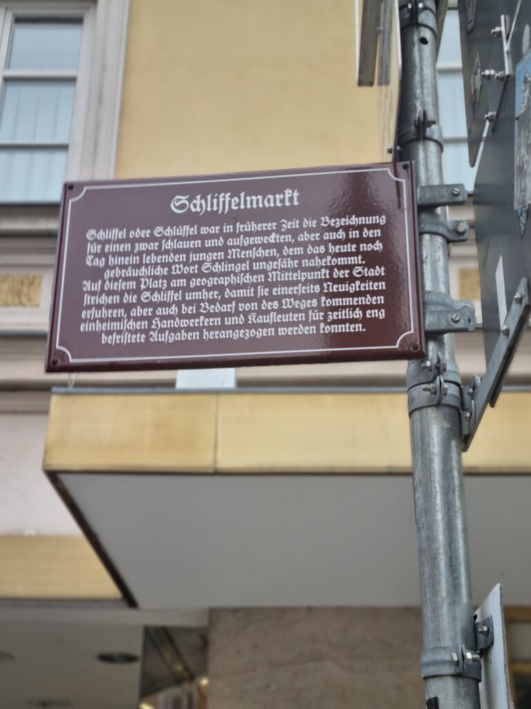 Infos bekomme ich nicht nur aus dem Prospekt, sondern auch an manchen kleinen Tafeln. Eine von diesen finde ich am „Schliffelmarkt“. Hier liest man: „Schliffel oder Schlöffel war in früherer Zeit die Bezeichnung für einen zwar schlauen und aufgeweckten, aber auch in den Tag hinein lebenden jungen Menschen, dem das heute noch gebräuchliche Wort Schlingel ungefähr nahekommt.