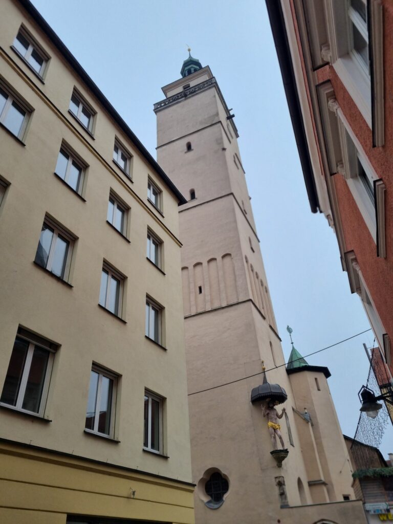 Kurz vor dem Rathausplatz kann ich die Moritzkirche, die älteste Kirche Ingolstadts, bestaunen. „Neben dem eigentlichen Kirchturm ragt hier der gotische Pfeifturm, der ehemalige städtische Wachturm, in die Höhe.