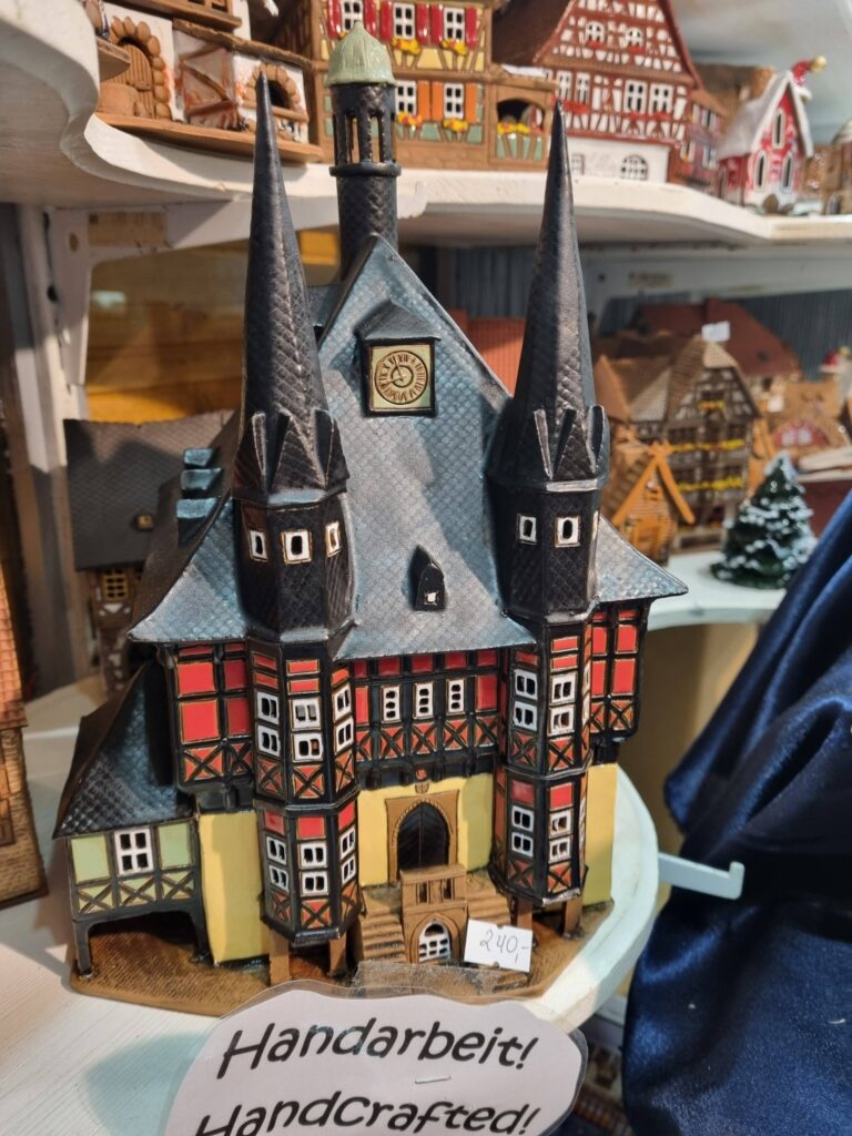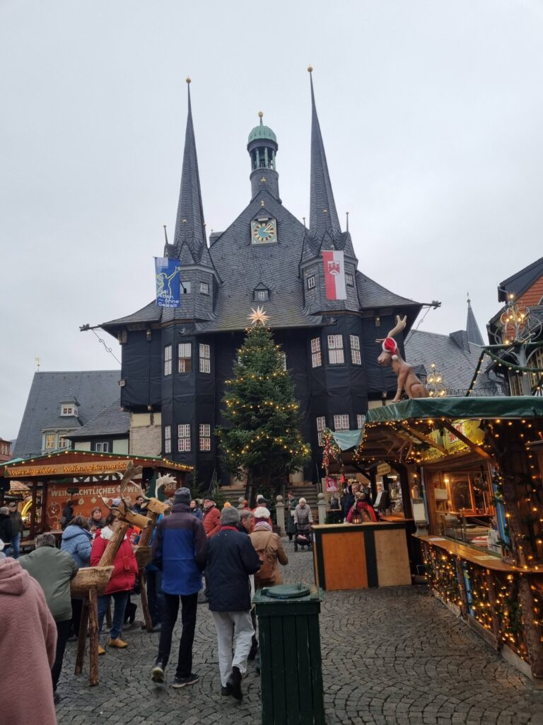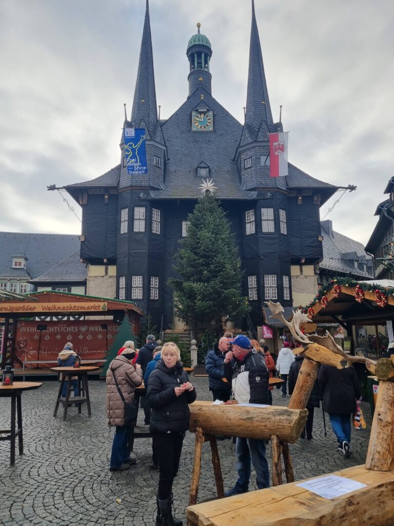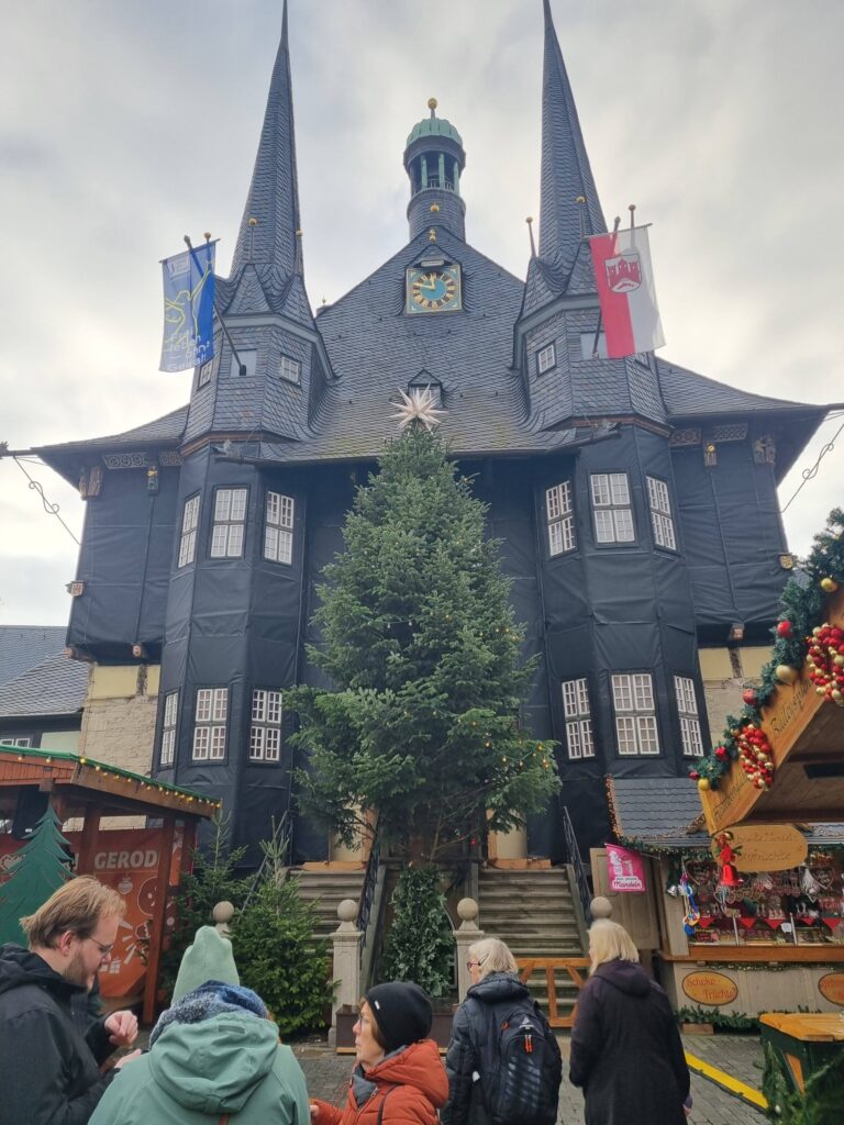 An vielen Marktständen wurden Nachbildungen des Rathauses aus Holz oder Keramik als Souvenir angeboten. Doch so schön, wie ich es in Erinnerung hatte, war es dann doch nicht. Das Fachwerk und die zwei schlanken, den Eingang flankierenden Erker, waren durch eine Schutzfolie verdeckt. Marktstände und ein Weihnachtsbaum machten es kaum möglich, dass Bauwerk in voller Pracht zu fotografieren.