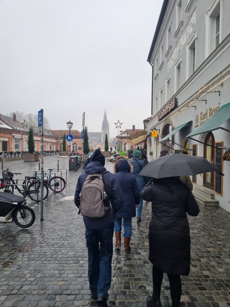 Daran erinnert neben dem Stadtamhofer Stadtwappen auch die Uhr über dem Portal. Es regnet immer kräftiger und einige Reiseteilnehmer verdrücken sich lieber am „Brückenbasar“ in eines des Cafés.
