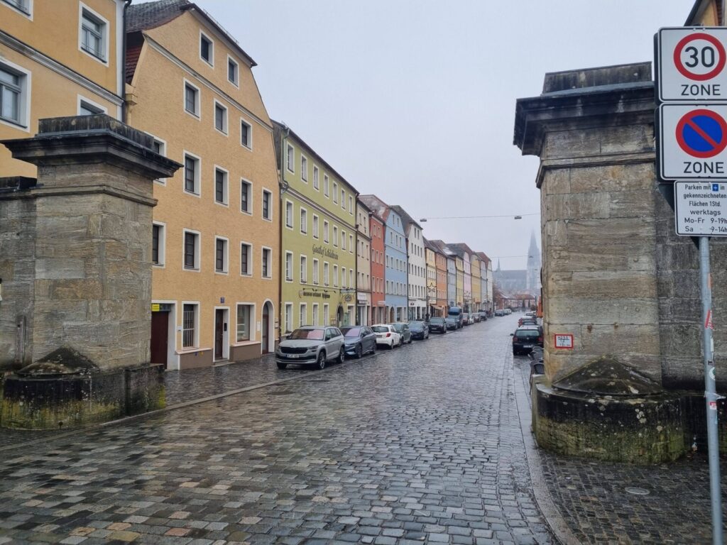 Auf dem Weg zur Steinernen Brücke reihten sich Cafés und Kneipen nahezu aneinander. An einem Gebäude, in dem sich heute eine Bankfiliale befindet, findet man über den Eingang ein Wappen, dass das Gebäude als ehemaliges Rathaus ausweist.