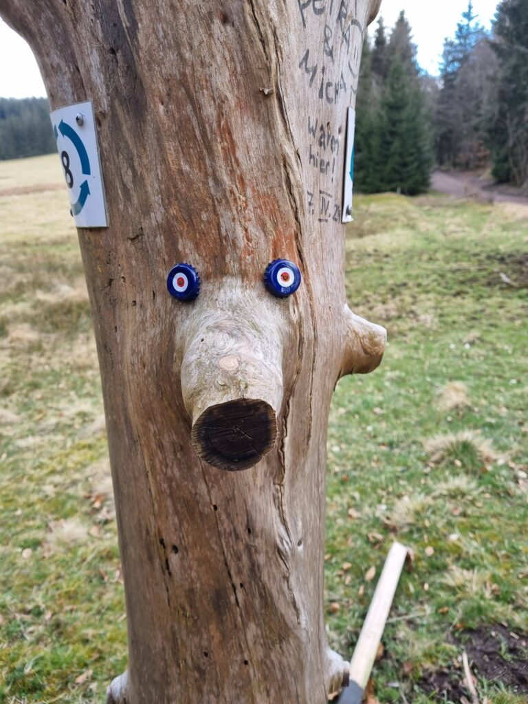 Den Gipfelstempel auf dem Ruppberg mit der Nr. 399 haben wir „im Sack“. Somit sind alle drei Zwischenziele auf der kleinen „Kids-Tour“ erreicht. Uns sind jedoch 2,6 Kilometer bei 96 Höhenmetern etwas zu wenig und weil wir schon den Stempel Nr. 56 an der Braukopfhütte erbeutet haben, wollen wir „nahtlos“ auf den 10,1 Kilometer langen Rundweg „Große Acht“ von Steinbach-Hallenberg wechseln.