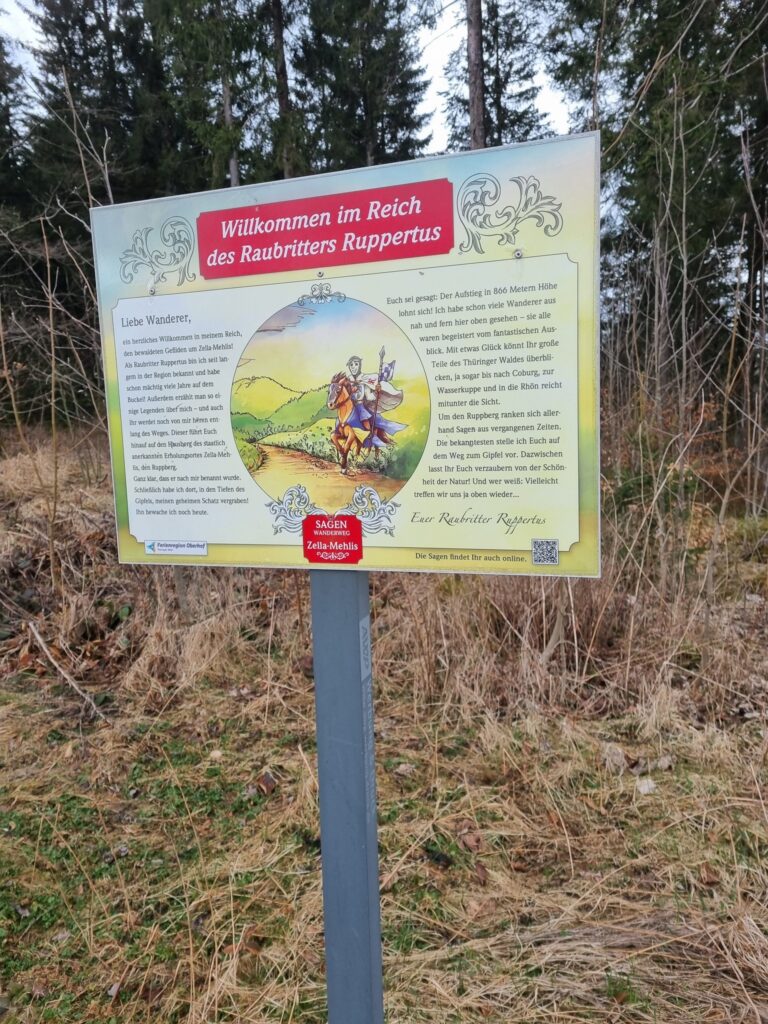 Noch nicht erwähnt wurde, was auf der ersten Tafel auf dem Sagen-Wanderweg Zella-Mehlis zu lesen ist. Hier heißt der Raubritter Ruppertus besonders die kleinen Wanderer auf dem Weg zum Hausberg der Zella-Mehliser willkommen.