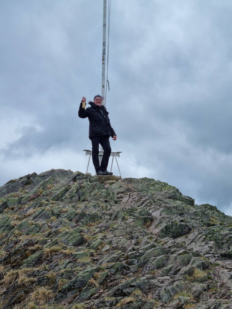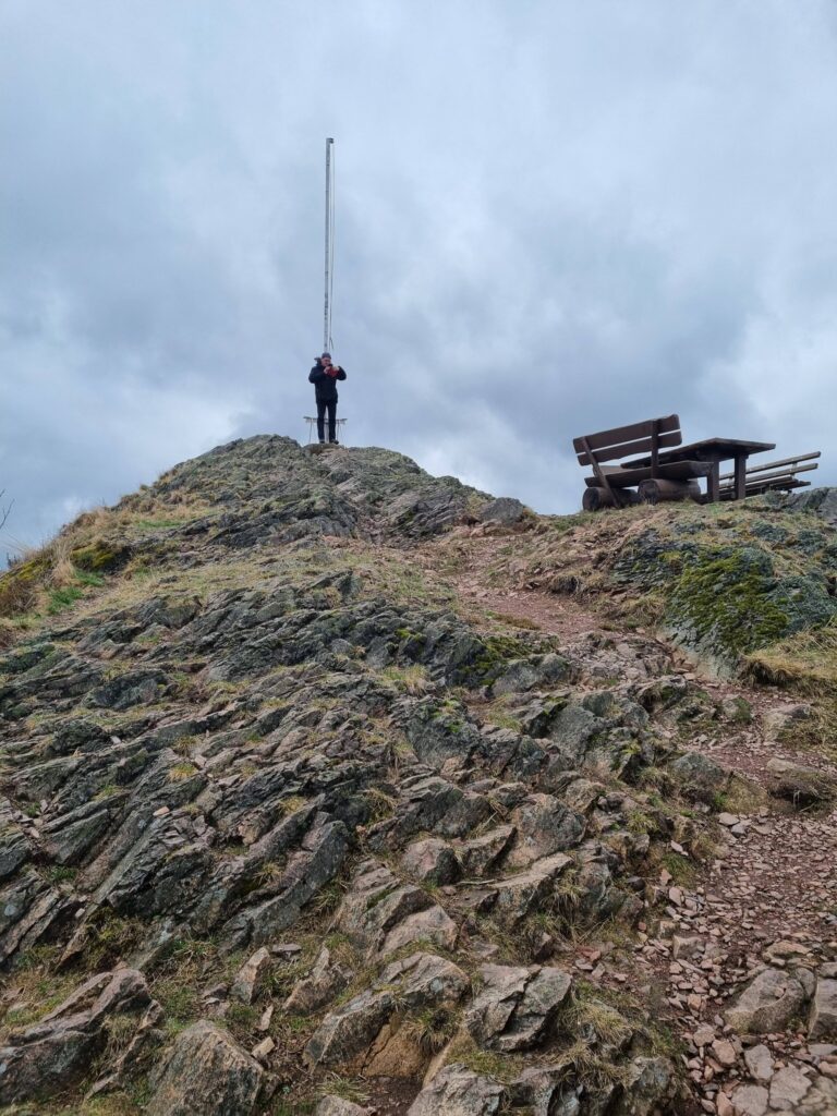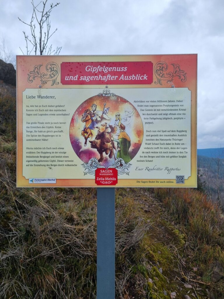 Die Begeisterung über die Ausblicke steigert sich Schritt für Schritt und kurz vor dem Gipfel grüßt nochmals Raubritter Ruppertus. Auf der Tafel „Gipfelgenuss und sagenhafter Ausblick könnte Ihr lesen: „Der Ruppberg ist der einzige freistehende Bergkegel und besitzt einen eigenwillig geformten Gipfel. Dieser verweist auf die Entstehung des Berges durch vulkanische Aktivitäten vor vielen Millionen Jahren.
