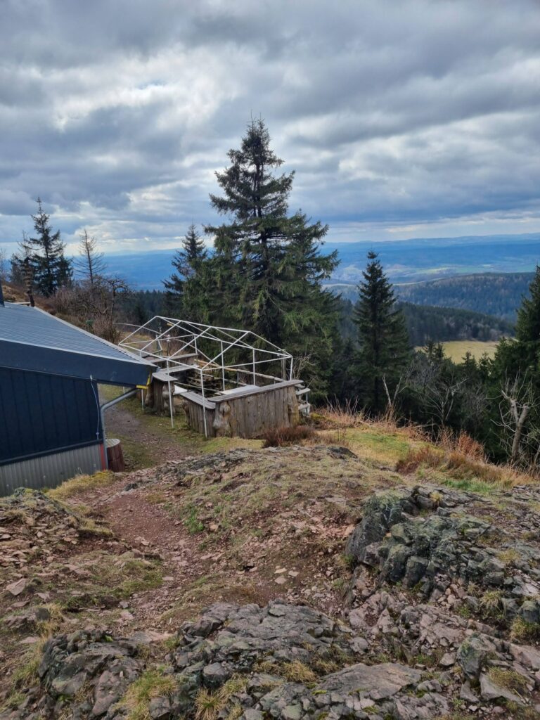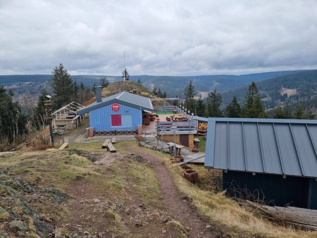 In der Mitte steht die blaue Berghütte mit der großen Aussichtsterrasse. Leider wird sie nur von Mai bis Oktober samstags und sonntags bewirtschaftet. Am 31. März 2025 mussten wir uns natürlich aus dem Rucksack versorgen.