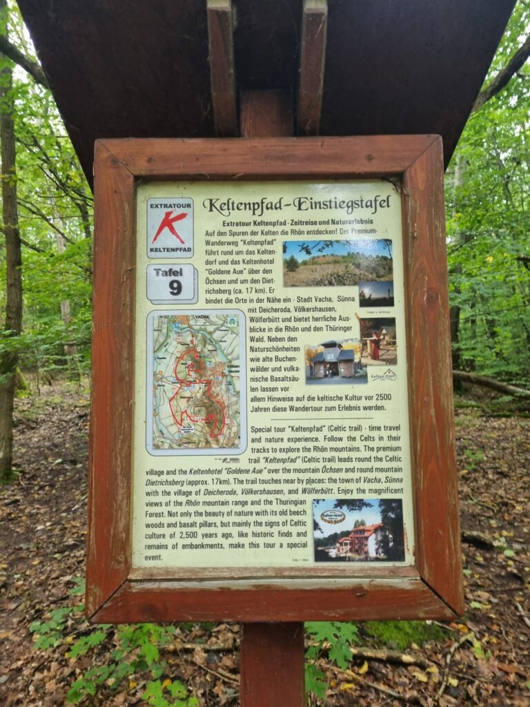 Um aber an die drei Stempel (Nr. 95 bis 97) zu kommen, gibt es auch weniger aufwändige Routen. Von Vacha fährt man über die L 2601 nach Völkershausen. Am Ende der Rodenberger Straße stößt man hier auf eine erste Infotafel zum Keltenweg, der hier mit 17 km und 609 Aufstiegshöhenmetern beschrieben wird.