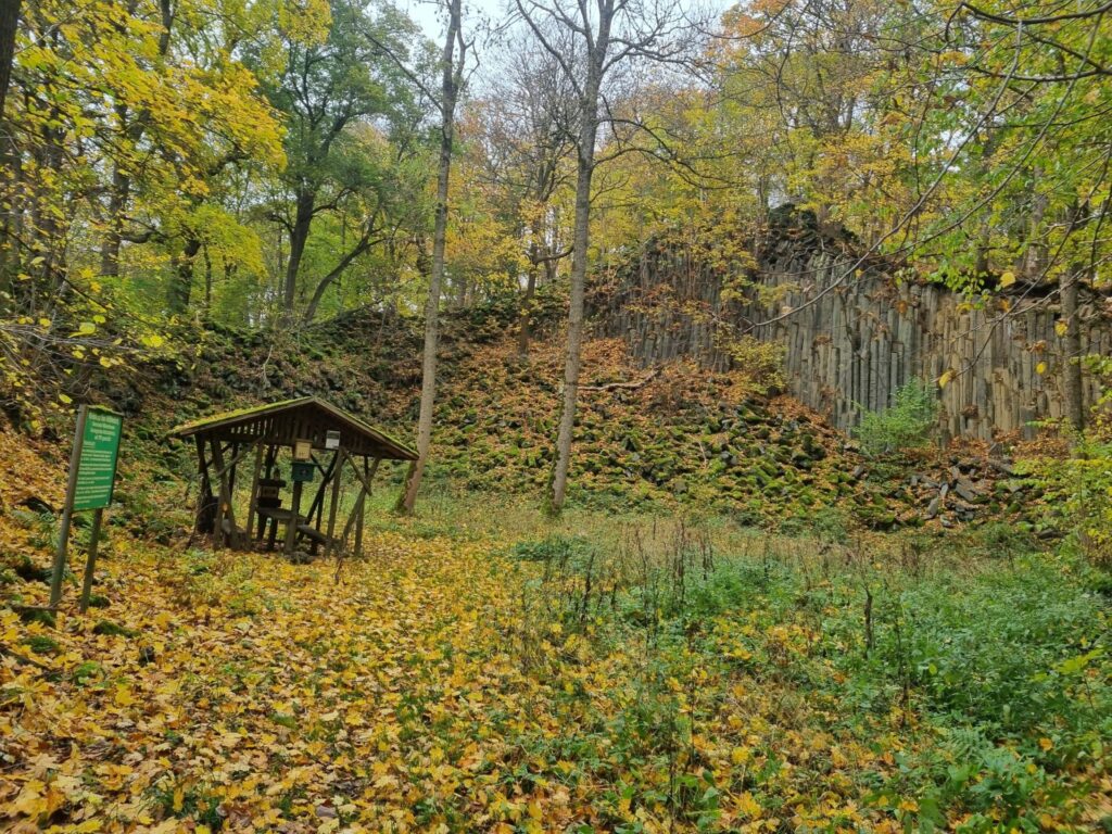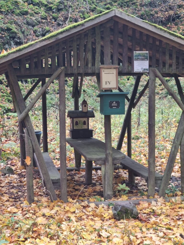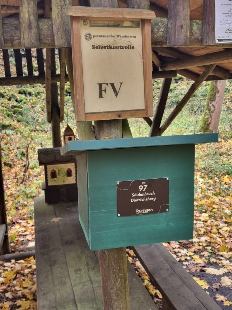 Geologen finden alles Wissenswerte auf einer Infotafel und Stempeljäger finden den Stempel Nr. 97 an einer Schutzhütte. Mit diesem im Tourenheft ging es dann zurück zum Wanderparkplatz „Spinne“ und weiter auf der B 62 in Richtung Osten.