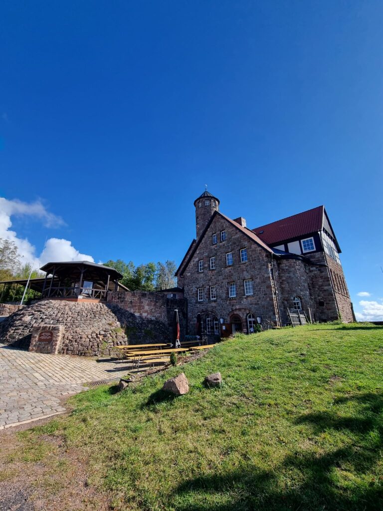 Nach etwa 35 Minuten waren wir oben angekommen. Hier fanden wir eine große Infotafel zum Werra-Burgen-Steig, der durch drei Länder und durch „Deutschlands grüne Mitte“ führt.