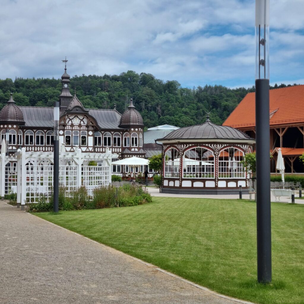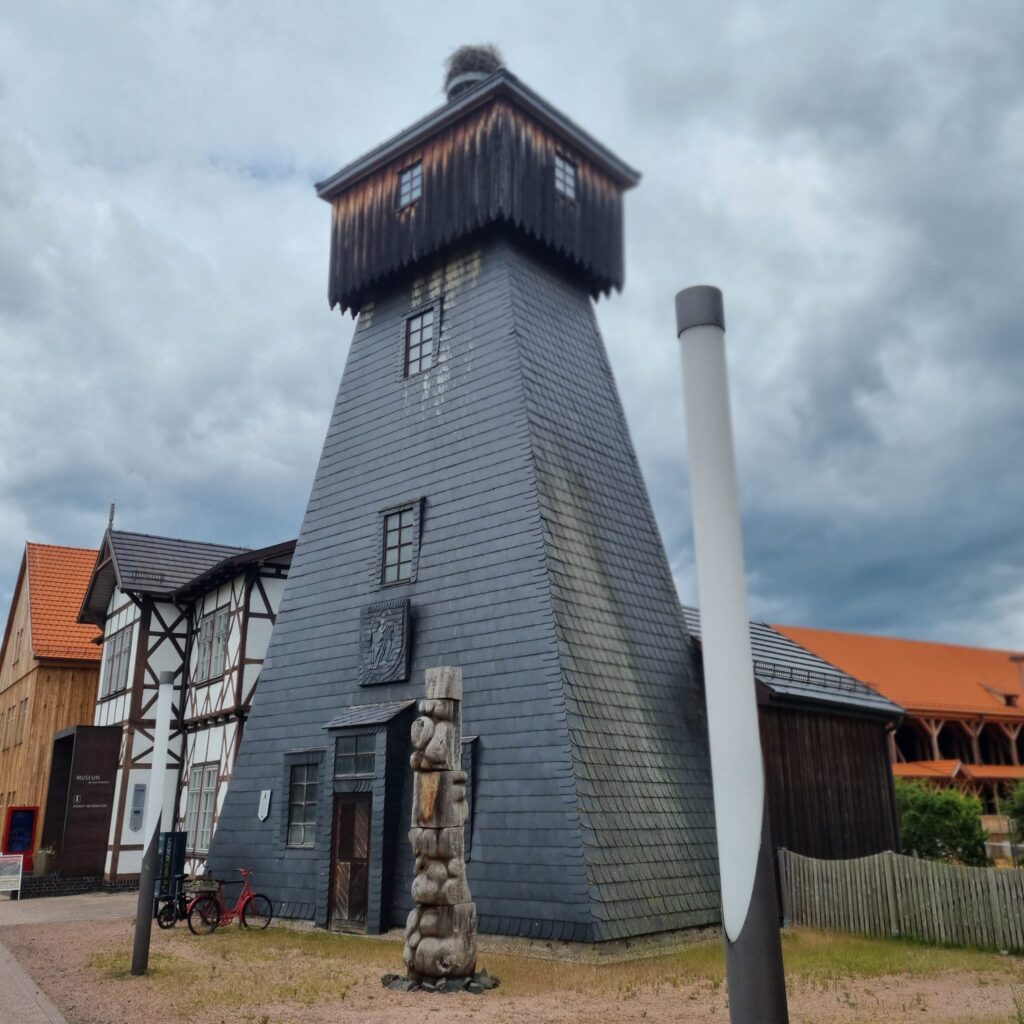 Auch wenn man nicht gewillt ist, eine der beiden Wandertouren am Puschkinpark anzugehen, sollte man sich die wunderschönen Fachwerkbauten der Kuranlage und den historischen Bohrturm direkt am „Museum am Gradierwerk“ einmal näher anschauen.